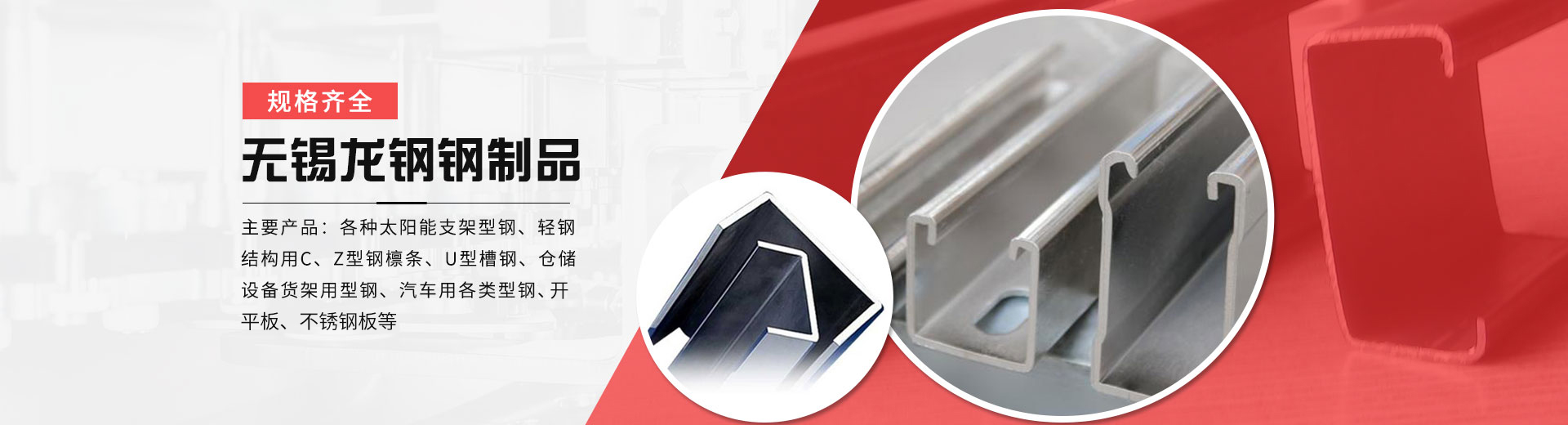 無錫市龍鋼鋼制品有限公司位于風景秀麗的太湖之濱---無錫前洲鎮,緊依滬寧高速玉祁出口,前洲工業園,交通十分便利,地理位置優(yōu)越。本公司是生產各種冷彎型鋼的專業廠家,公司擁有雄厚的技術力量,優(yōu)越的生產設備,良好的生產工藝,完善的質量保障體系。主要產品:各種太陽能支架型鋼、輕鋼結構用C、Z型鋼檁條、U型槽鋼、倉儲設備貨架用型鋼、汽車用各類型鋼、懸掛鏈輸送機導軌、公路護攔板及各種非標冷彎型鋼和各類高頻焊管。無錫龍鋼愿與您攜手共進,走向未來、共創(chuàng)輝煌。